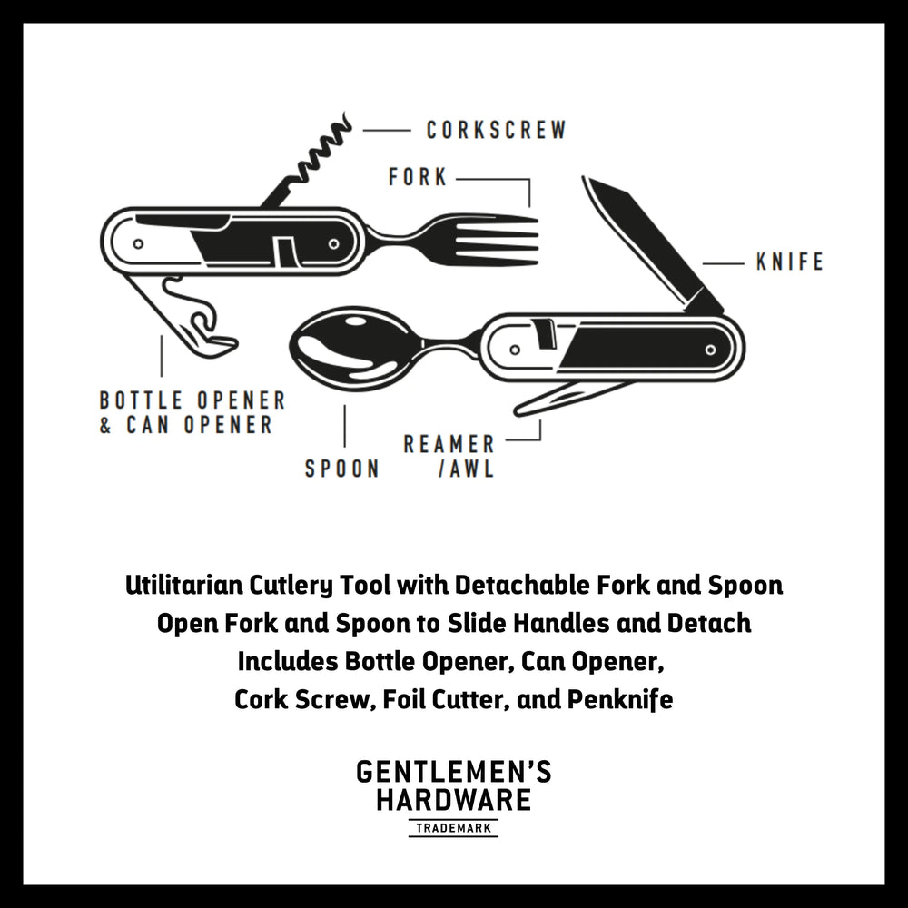 The handiest of compact camping accessories, each stainless steel utensil folds neatly into a smart wooden handle, and the fork and spoon are detachable for mealtimes. Comes in a sleek Gentlemen' s Hardware signature-style presentation box making this practical tool the perfect gift for camping enthusiasts everywhere.